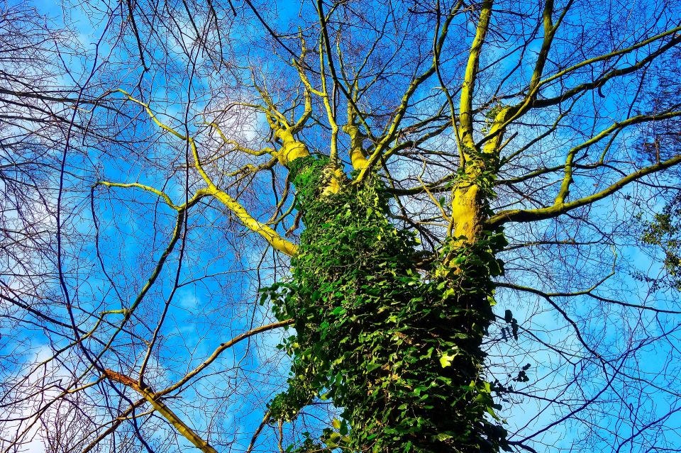 Straw sucked 'til left only a drop of translucent yellow, spent and dry her leaves hang. The glorious green boa; the siphon sups higher and higher into her crown, anointed by the chrism of trunk and branch; outstretched, submitting and proud. Dancing Ring a Ring o' Roses, life, death and her. Now to be eaten up by the spoon that fed her, all brown and hungry and full. A frenzy of filaments, unfurling, reaching, slurping down, down the onward path. No dead end, just the whirl and spin of fragments combining. Baked into new forms but becoming, always becoming.